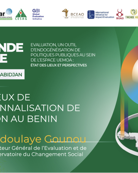The Beninese government had started institutionalization evaluation in 2007. Until now Benin places governance and accountability in the heart of action; the evaluation function was moved to the Presidency, under the Minister of State, General Secretary of the Presidency to better centralise and influence M&E in the country.