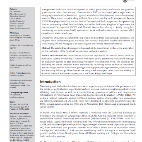 The emergence of government evaluation systems in Africa: The case of Benin, Uganda and South Africa